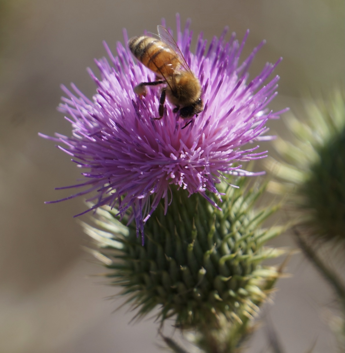 Cardo Púrpura. Nombre genérico: Cirsium Vulgare. Abeja. Apis Miellifera. Colinas de Berkeley, California, USA. Cámara, Carlos Andrés Vanegas Grisales.