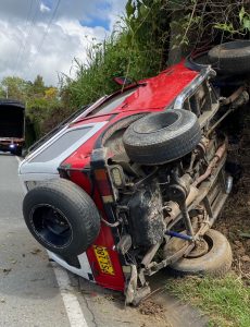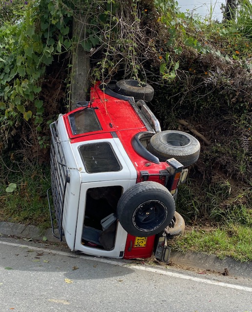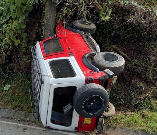 El politólogo Juan Bernal salió ileso del volcamiento en su jeep Suzuki la mañana del 10 de febrero de 2024, un kilómetro antes del Alto de La Unión.
