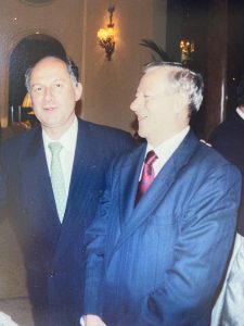 El científico Manuel Elkin Patarroyo con Alfredo Vanegas Montoya, Miembro de la Junta Directiva de la Liga Colombiana Contra el Cáncer, Vicepresidente de Medicáncer y Presidente del Centro de Historia de Envigado, durante un Foro Internacional en Madrid, España.