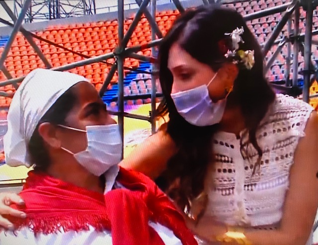 La Gestora Social Diana Osorio, Esposa del Alcalde de Medellín Daniel Quintero, felicita a una Silletera durante el Desfile de la Feria de las Flores 2021 en Medellín, Colombia