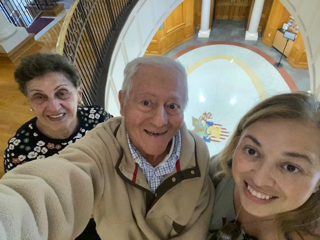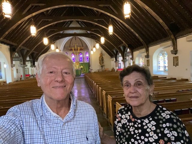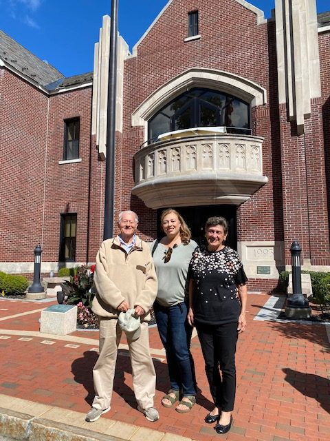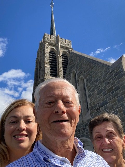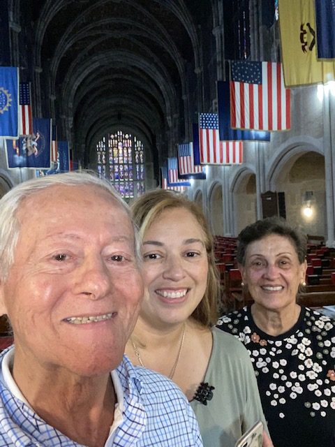 Edna Pomygalski, Beatriz Jaramillo y Alfredo Vanegas frente al Templo Católico de West Point.