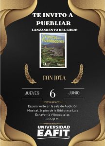 El 6 de Junio a las tres de la tarde el destacado periodista presenta en la Universidad EAFIT la obra Crónicas de Puebliadores vivida con amigos y colegas en los confines de Antioquia, auspiciada por la Institución Universitaria de Envigado y de excelente aceptación en la Feria Internacional del Libro de Bogotá.