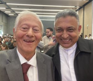 Rector de la Universidad Pontificia Bolivariana, Sacerdote Diego Alonso Marulanda Díaz, derecha, y Presidente del Centro de Historia de Envigado, Alfredo Vanegas Montoya, izquierda, asistentes al Encuentro de Afiliados de la Cámara de Comercio de Medellín Para Antioquia 2026.