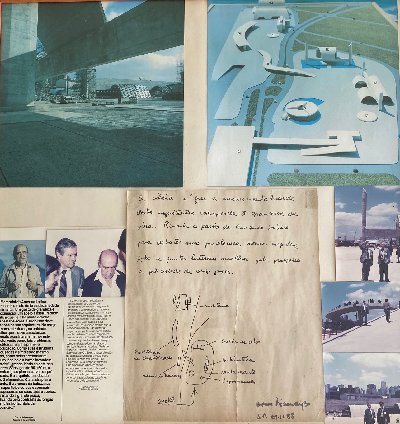 Arquitecto Oscar Niemeyer, Nació en Río de Janeiro el 15 de diciembre de 1907, falleció en la misma ciudad el 5 de diciembre de 2012. Participó en el diseño y construcción de Brasilia, la sede de Naciones Unidas en Nueva York y el Memorial de América Latina en Sao Paulo donde regaló, a Alfredo Vanegas Montoya, un boceto a mano alzada de esa obra como lo registra la gráfica.